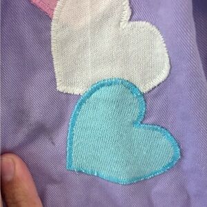 Adorable purple kids overalls featuring a colorful heart design. Perfect for playful days.
