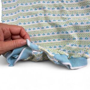 Charming romper with blue and yellow design. Soft fabric and short sleeves.