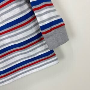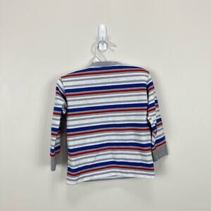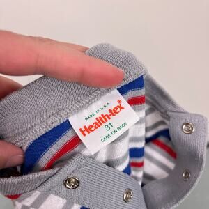 Vintage Healthtex Striped Long Sleeve Shirt. Toddler boy size 3T. Made in the USA. Casual top in gray, blue, red, and white stripes. Button placket. So cute for every day play paired with jeans!