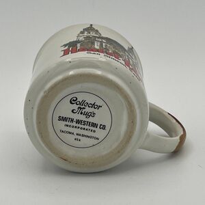 Relive your memories of a California icon with this charming vintage Hearst Castle souvenir mug! This classic ceramic mug features a detailed illustration of the magnificent Hearst Castle in San Simeon, California, bringing the grandeur of the historic landmark right to your kitchen. The mug boasts a speckled off-white glaze with a rustic brown rim and handle, typical of vintage souvenir ware. Marked as a "Collector Mug" by Smith-Western Co. and proudly "Made in USA," this piece is perfect for adding to your mug collection.