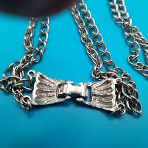 *Description: This is a vintage long, layered, etched heart pendant necklace from around the 1960s to 1970s. The clasp is in the shape of a bow with a fold over snap center. The heart is hanging on the center chain with a longer outer chain, giving the necklace a layered look. This would be a great addition to your jewelry collection or make a great gift!