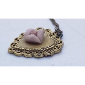 Vintage Heart Necklace Pink Porcelain Rose Gold Plated Filigree Artisan Handmade