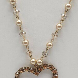 This elegant vintage necklace features a heart-shaped pendant adorned with sparkling rhinestones. The gold-tone chain is interspersed with pearls and clear beads, offering a timeless aesthetic appeal.