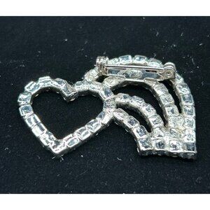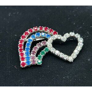 This vintage heart-shaped pin brooch is adorned with sparkling rainbow rhinestones, perfect for adding a touch of retro glamour to any outfit. A unique accessory for collectors and fashion enthusiasts alike.