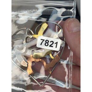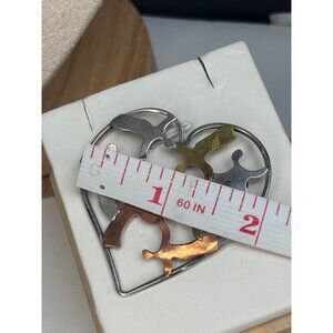 This exquisite vintage brooch beautifully combines artistry with timeless design. Crafted in a heart shape, it features an intricate pattern of interlocking figures in silver, gold, and copper tones. A true statement piece that captures the essence of vintage elegance, perfect for adding a touch of charm to any ensemble.