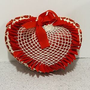 Vintage Heart Shaped Toss Pillow - Mid Century Romantic Boudoir decor - a decorative red satin & ribbons adorned pillow caged in a creamy white crochet trim. This pillow is absolutely charming - appears to be handmade - would make a wonderful vintage love token/gift for someone special. In excellent vintage condition - minor overall wear - no damage or flaws - so cute!