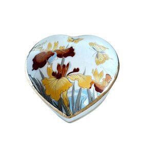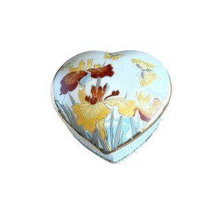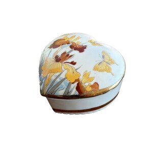 This elegant heart-shaped trinket box features a delicate floral and butterfly design, making it a charming keepsake. Crafted from porcelain, its intricate pattern adds a touch of sophistication to any space. Ideal for storing small treasures or adding a decorative touch to your vanity or desk.