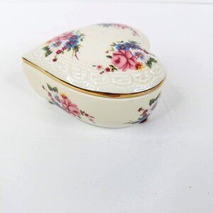 This vintage heart-shaped trinket box features intricate floral designs and a glossy finish. Ideal for storing jewelry or keepsakes, it's an elegant addition to any collection. The ceramic material ensures durability while the detailed artwork adds a touch of charm to your decor. Preowned