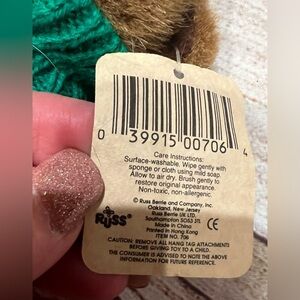 This vintage 7-inch Russ Berrie Teddy Bear is a perfect addition to any stuffed animal collection. With its adorable shamrock design and small size, it is recommended for children ages 5 and up. The bear is part of the Vintage Russ collection and is perfect for collectors or anyone who loves stuffed animals. It comes from a line of Irish shamrock teddy bears and is sure to bring a smile to anyone's face. Add this jointed bear to your collection today! Smoke free home.