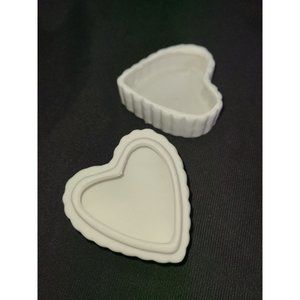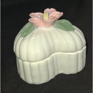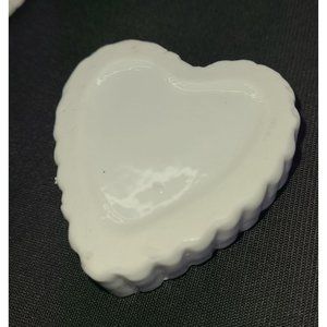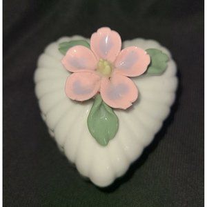 Vintage white porcelain heart shaped trinket box with a pink flower on top. No chips or cracks 2" x 2.5"