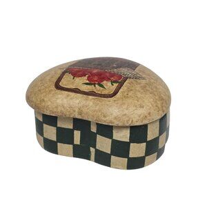 This Unbranded Vintage Heart-Shaped Ceramic Trinket Box features a charming apples basket design. Perfect for 1980s Country Chic home decor, its checked pattern and beige color adds a quaint touch to any small space.