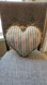 Charming heart-shaped pillow with floral and striped design. Features blue, pink, and gold colors.