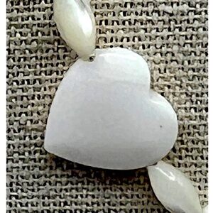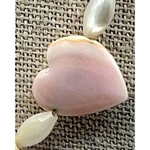 This charming, vintage necklace features heart-shaped shell accents interspersed with delicate mother of pearl beads. Each heart tells a story of the ocean, with their subtle variations and natural imperfections adding character to this exquisite piece. The soft pink and white hues evoke a sense of timeless elegance and connection to nature. Perfect for expressing love in a tangible form, this necklace is a heartfelt accessory that will complement any outfit.