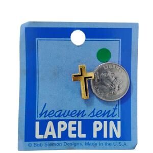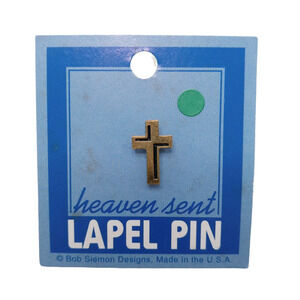 Gold tone lapel pin with “Heaven Sent” cross design from a 1990s Christian bookstore.
