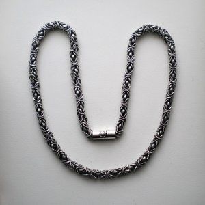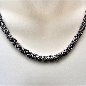 Beautiful Gorgeous Vintage Heavy Artisan Handmade solid Sterling Silver BYZANTINE Necklace Chain (unmarked but acid tested). This unique Necklace Chain is about 22 3/8" in length (with clasp), about 6mm in its widest and weighs approximately 83 grams. It is in great vintage used pre-owned condition.