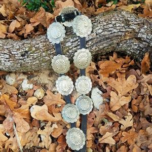 Very old Heavy Concho belt, conchos are 2"x 2.25", buckle is 3"x 2.75", belt is 43.5in long. 337g total weight, nickel silver