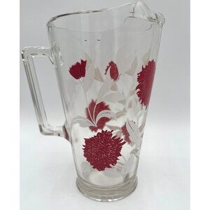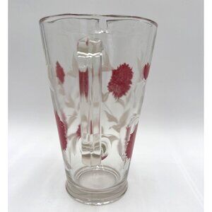 This vintage clear glass pitcher features a vibrant red floral design, adding elegance to any setting. Ideal for serving beverages, its sturdy handle and pouring spout ensure practical use. A timeless piece for collectors or functional home decor.