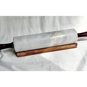 Vintage Heavy Marble Rolling Pin with Stand - Dark Wood, White and Grey Marble
