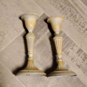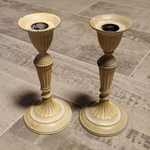 Vintage Heavy Metal Patina Candle Holders, good condition and variation of colors natural to them. Great color pallet to match all decor.