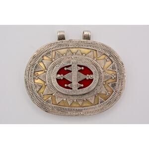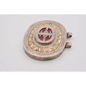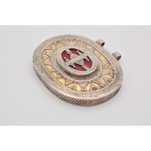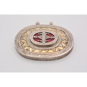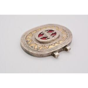 Vintage Heavy Pendant Red Inlay Oval Unisex Enamel Roman Greek Pattern 9B
