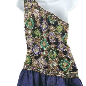 This exquisite George F. Couture gown combines vintage glamour with a touch of modern elegance. The richly beaded bodice features an intricate geometric diamond pattern in vibrant jewel tones of green, purple, and gold. The asymmetrical one-shoulder design adds sophistication, while the heavy, full-length skirt in deep navy contrasts beautifully with a hidden slit revealing a lighter violet lining. A beaded tassel detail at the waist enhances the gown’s movement and allure, making it an unforgettable statement piece for formal occasions or collectors.