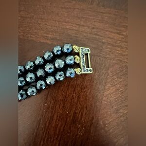 This stunning bracelet features 3 strands of round glass beads with an oval center station; bezel-set, faceted octagonal glass stone center framed by 2-tiered border of pavé-set round crystals.