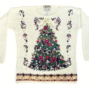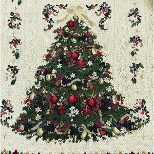 Celebrate the holidays in true vintage style with this Heirloom Collectibles Christmas sweater (design copyrighted 1999). Features an intricately embroidered Christmas tree with florals, sequins, and beading, set on a cozy cream knit with cable detail and scalloped edges.