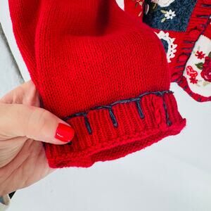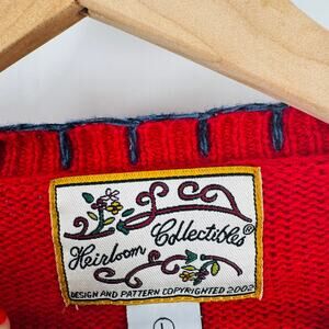 Charming vintage Heirloom Collections cardigan featuring a whimsical heart and floral patchwork design in shades of red, white, navy, and cream. Detailed with embroidered and appliqué hearts, flowers, and lace accents throughout for a cozy, nostalgic look.