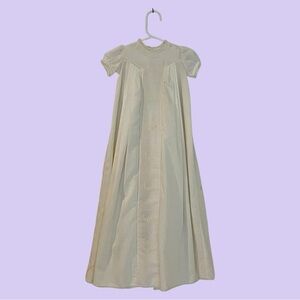 Vintage Heirloom Embroidered Beige Cotton Custom Made Gown Dress 2 piece set. This is a BEAUTIFUL vintage christening gown (or could be worn as a toddler dress). Would be beautiful for photos. There is a small stain, I have not treated but should come out nicely.