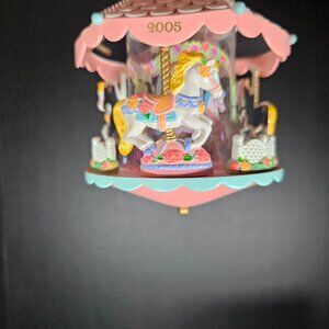 Rare Find: This item is hard to come by. This is the heirloom ornament collection Pretty Ponies Carousel Ornament, dated 2005. The ornament illuminates when connected to a Christmas tree light. The manufacturer is Carlton. The ornament has a pink roof and multi colored horses. It measures 4.5 inches tall and is made of hard plastic. Condition is excellent in original nice box. Non-smoking pet free home.