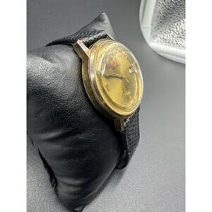 This vintage Helbros "Invincible" wristwatch is a timeless piece that any collector would love to own. Crafted with a round, gold-plated case and matching gold-filled band, this watch exudes a classic sophistication that can be worn casually or formally. The beige dial features a 12-hour display, day indicator, and push/pull crown for easy adjustment. The watch is powered by a 17-jewel mechanical manual movement, ensuring accurate timekeeping.