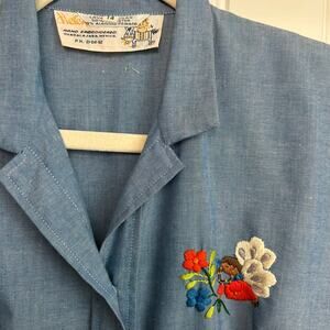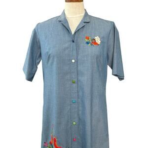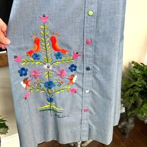 Style tags: Helen Cerda, hand embroidered, vintage shift dress, floral embroidery, chambray blue, short sleeve, button front, midi length, folk art, Mexican embroidery, boho vintage, artisan made, handmade details, ethnic embroidery, cottagecore, 1970s fashion, signed artist