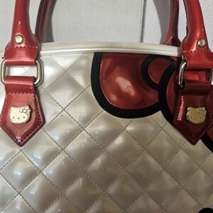 This vintage Hello Kitty handbag is a large satchel/top handle bag featuring a Hello Kitty theme with a white exterior adorned with a red bow. The bag is made of pleather with silver hardware accents and a faux leather red handle/strap. Measuring 16 inches in width, 12 inches in height, and 6 inches in depth, this stylish accessory is perfect for fans of Hello Kitty and 90s nostalgia. The white exterior and lining add a clean and classic touch to the overall design. See pictures for condition- some scuffs on exterior and interior could use a cleaning. Good condition and well taken care of. Comes from a smoke free home