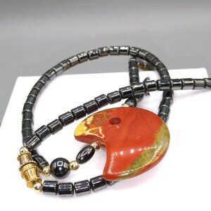 Description * Beautiful unisex necklace is vintage. Made of hematite beads, it features a really cool abstract red jasper stone centerpiece. Very modernist hand crafted artisan choker with a barrel clasp. Really nice piece!