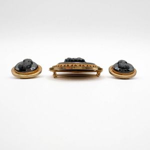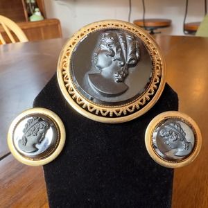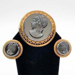 Vintage Hematite Cameo Intaglio Brooch And Clip On Earrings Set W German Style