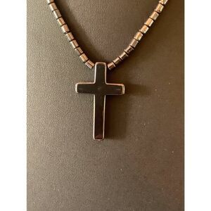 Vintage Hematite Cross pendant with Hematite Cylindrical Beads, set in Gold tone screw clasp