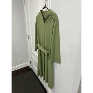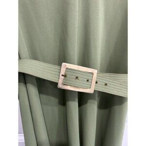 This green belted midi dress is designed for the modern professional. Its classic style features a sleek silhouette with a belt to define the waist, providing a refined and polished look. The comfortable, breathable fabric ensures ease of movement, making it an ideal choice for a day at the office or a professional event.