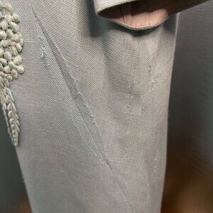 This vintage pale blue linen dress by Henry Lee would be an adorable addition to any wardrobe. It has a sweet collared neckline, an embroidered leaf pattern, and short sleeves. Size 14 vintage, but fits more like a contemporary US Women's XS or Small. Please examine the photos carefully. This vintage piece has signs of wear, and the lining will need to be replaced.Sold as-is.