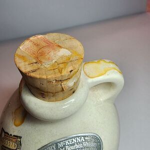 Vintage Henry McKenna Kentucky Bourbon whiskey crock half gallon with cork. In cream color with blue printing. still has sticker residue in areas around cork.