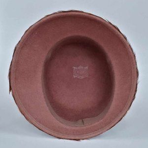 Vintage Henry Pollak "MELOSOIE" Cloche Bucket Gatspy style women's dress hat. Made of light brown 100% wool felt with the entire exterior covered with beautiful pheasant feathers. The feathers are multi-colored with brown, tan, rust, black, creme, and grayish-blue. The hat band is 1.5" wide black velvet ribbon. There is no size tag; the interior circumference (at the sweat band) is approximately 21.5". The hat is approximately 7" tall (in the front) and 9.5" wide (front to back). As is consistent with this style, the brim gradually gets wider from the back to the front of the hat. This hat is in excellent/mint condition! There are no marks or stains, no rips or tears, no missing or ruffled feathers! It appears to have hardly been worn.