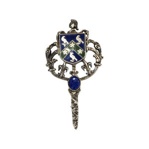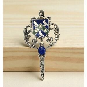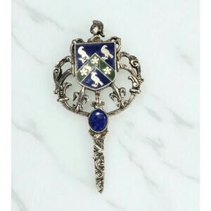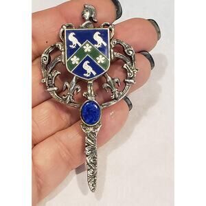 Vintage Heraldic Brooch Pin Silver Tone Crest Shield Blue Cabochon Sword Style