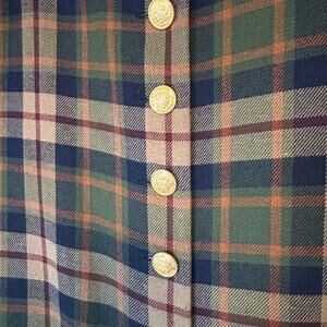 Elegant vintage heritage plaid maxi dress in a rich, classic colorway of camel and tan with hunter green, navy blue, and burgundy plaid. Finished with a navy velvet stand collar and a full row of decorative gold crest buttons, this dress has a timeless, polished look.