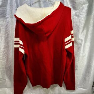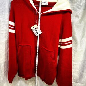 This Cardigan is a classic piece of clothing with a retro and preppy style. Made in the USA, this size large sweater features a red and white color scheme, perfect for the fall and winter seasons. With a hooded design and knit fabric, this cardigan exudes a varsity and university theme, making it a timeless addition to any wardrobe.