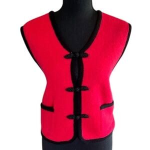 Classic red 100% wool vest by Herman Geist featuring black trim and traditional Chinese frog closures. Two front pockets. Tag size S. Made in China. Dry clean only. No major flaws noted.