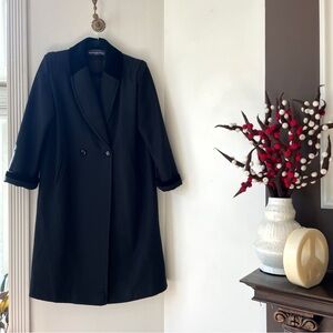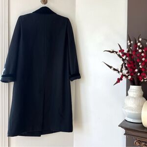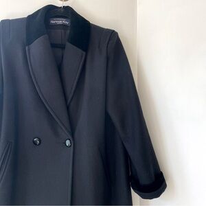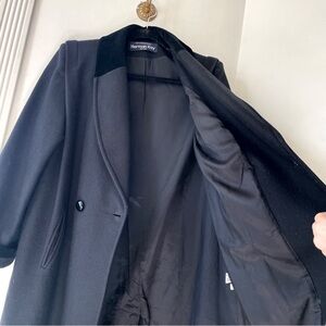 Vintage black wool blend velvet collar / shoulder padded double breasted long pea coat by Herman Kay Petite