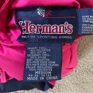Vintage Herman’s World of Sporting Goods puffer vest. Pink and blue with silver snaps. Elastic on both sides of the waist. Some discoloration on both sides of the neck, more on the blue side. Great condition.