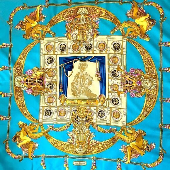 Vintage Hermes Paris Opera Garnier Baroque Silk Scarf, Turquoise Gold Lux 1483