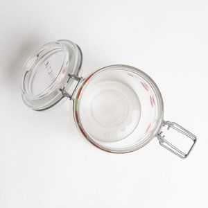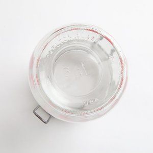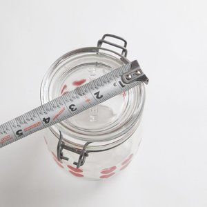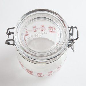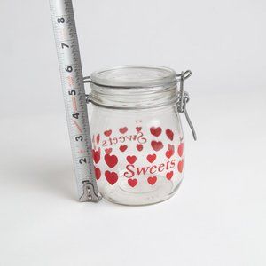 Vintage Carlton Glass 3/4L Hermetic glass stash jar with wire bale lid with red hearts and says "Sweets"