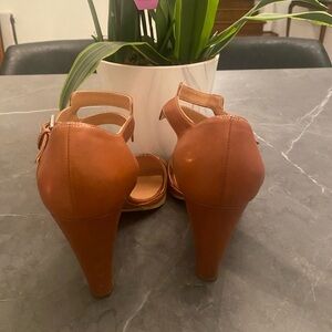 Authentic vintage Hermès heeled sandals featuring the iconic “H” strap design in smooth tan leather. These timeless sandals include a secure ankle strap with silver-tone buckle and a moderate heel, perfect for both casual elegance and elevated looks.