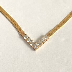 Vintage Herringbone Gold Tone Necklace V Shaped CZ Faux Diamond Collar 18” Chain